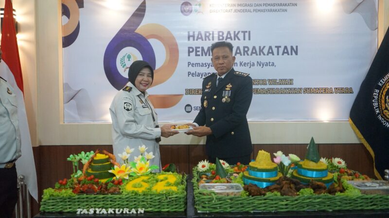 Rangkaian kegiatan peringatan Hari Bakti Pemasyarakatan ke-62 di Kanwil Ditjenpas Sumatera Utara ditutup dengan prosesi pemotongan nasi tumpeng sebagai simbol rasa syukur atas terselenggaranya kegiatan secara lancar, tertib, dan penuh makna.