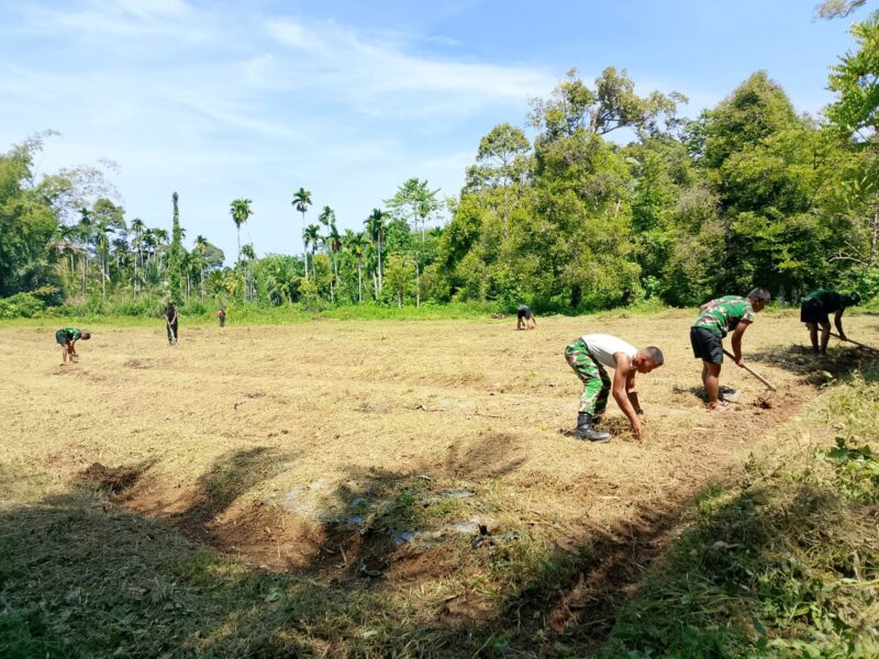 Dengan penuh semangat kebersamaan, personel TNI dan warga bahu-membahu membersihkan lahan dari semak belukar dan tanaman liar. Lahan tersebut nantinya akan dimanfaatkan sebagai area produktif guna mendukung kebutuhan pangan masyarakat setempat.