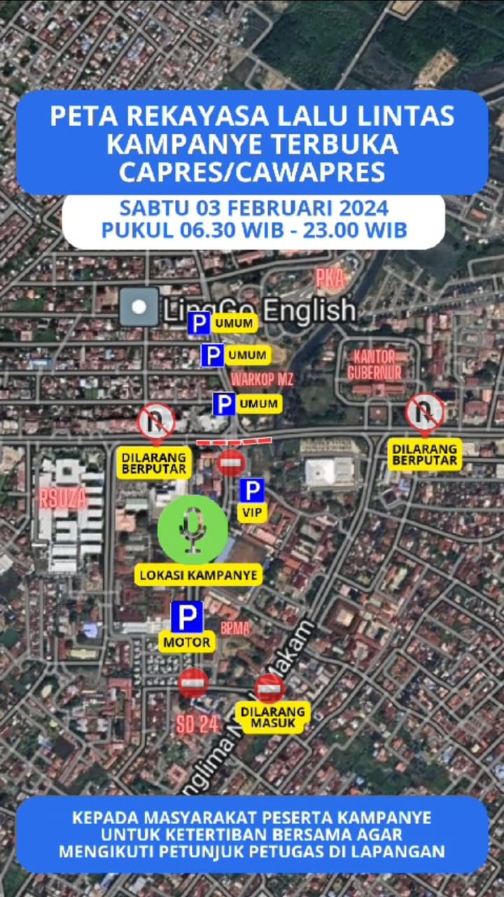 “Diinformasikan kepada masyarakat Kota Banda Aceh, akan ada rekayasa arus lalu lintas dalam rangka kampanye terbuka pasangan calon capres cawapres nomor urut 2. Rekayasa itu dilakukan pada Sabtu besok, 3 Februari 2024, pukul 06.30—23.00 WIB,” kata Kasatgas Humas Operasi Mantap Brata (OMB) Seulawah Kombes Joko Krisdiyanto, dalam rilisnya, Jumat, 2 Februari 2024.